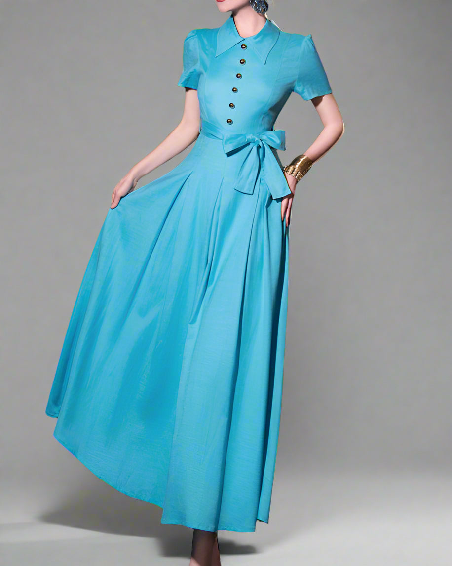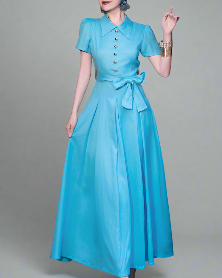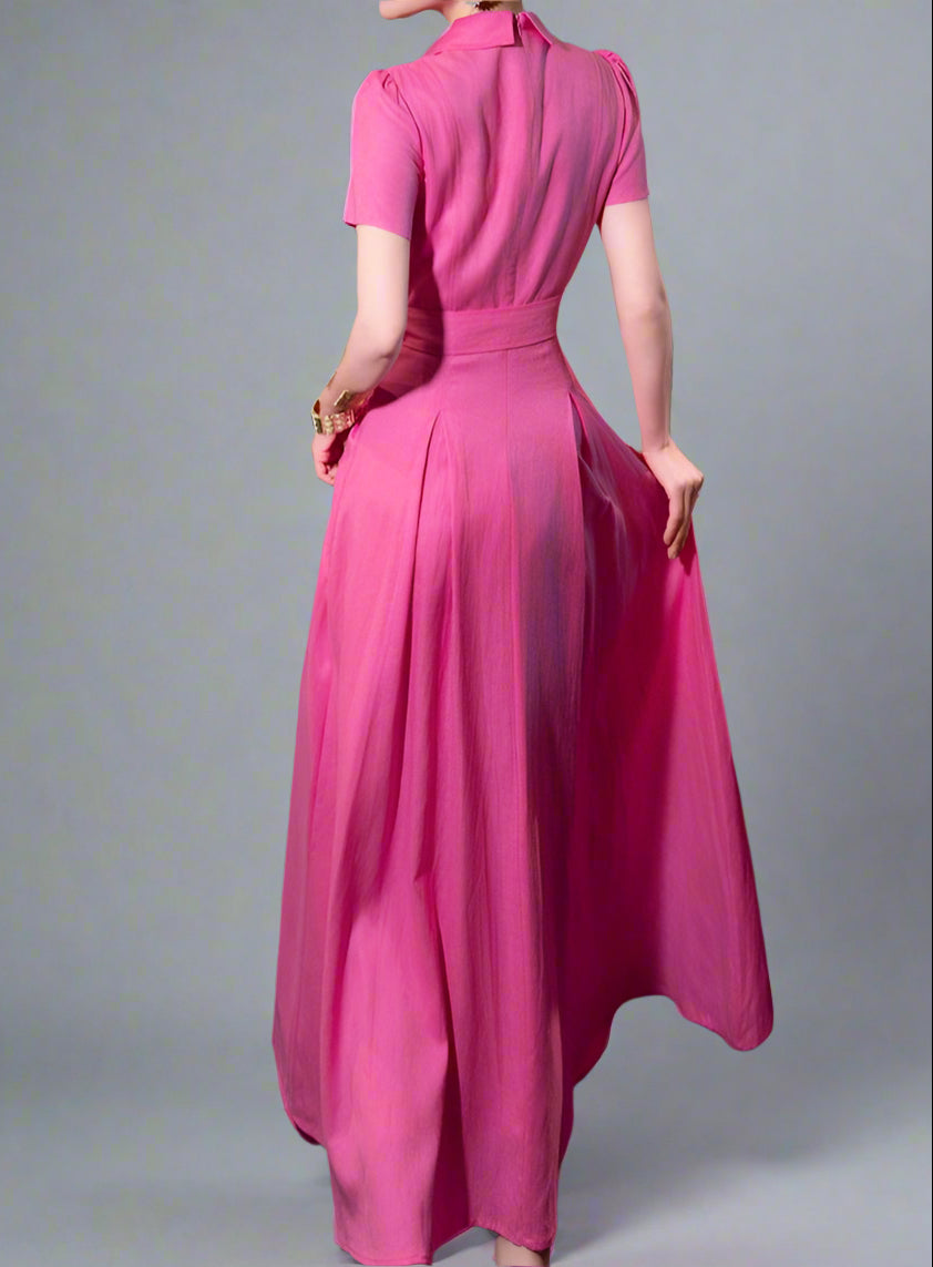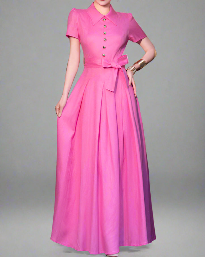This stylish and modern maxi dress features a sharp pointed collar, decorative metal buttons, and a stylish belted waist. Its full A-line skirt adds a touch of elegance, making it perfect for any occasion.