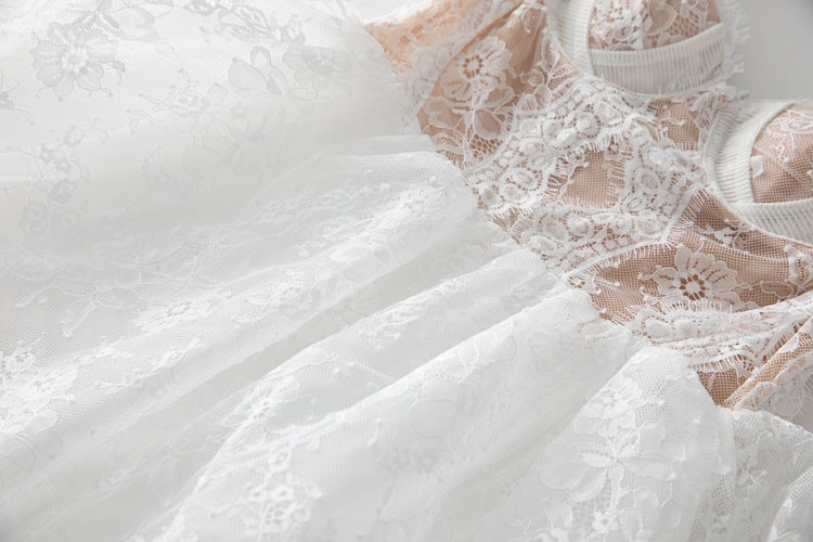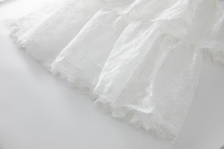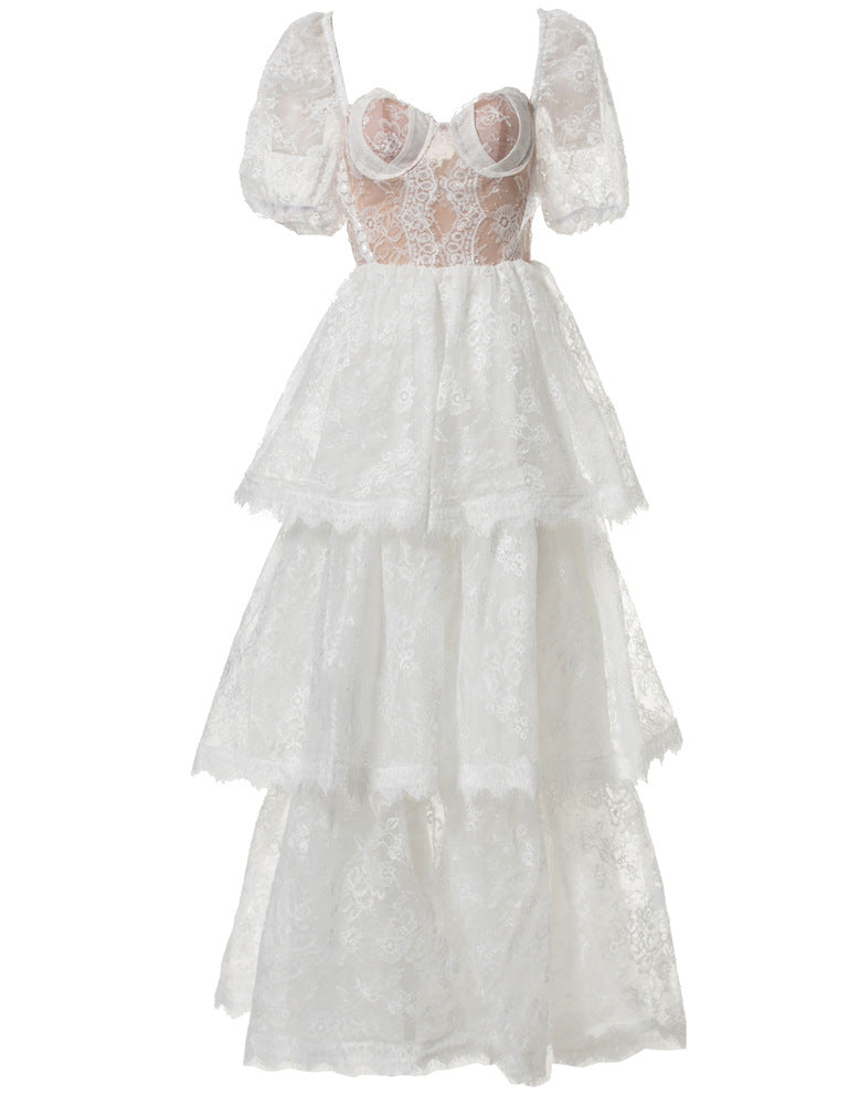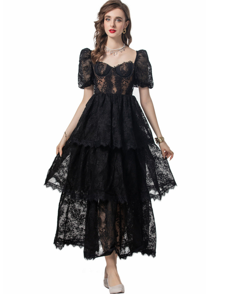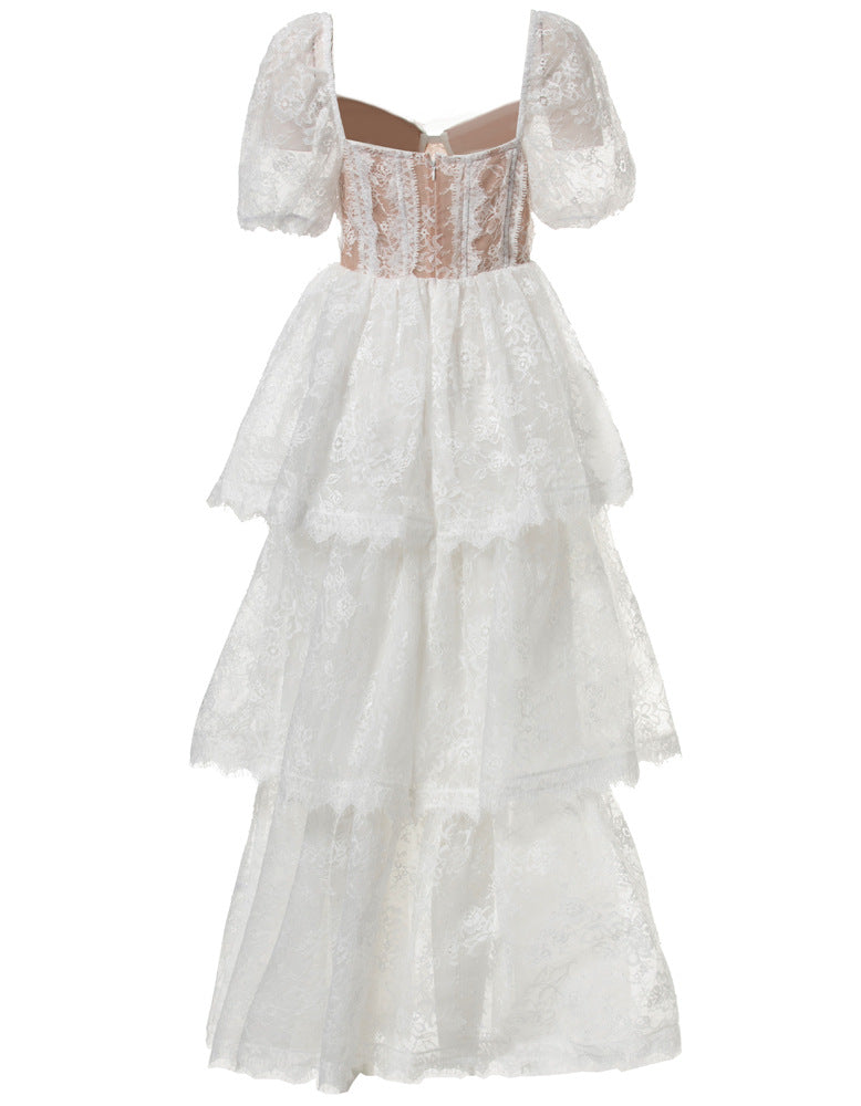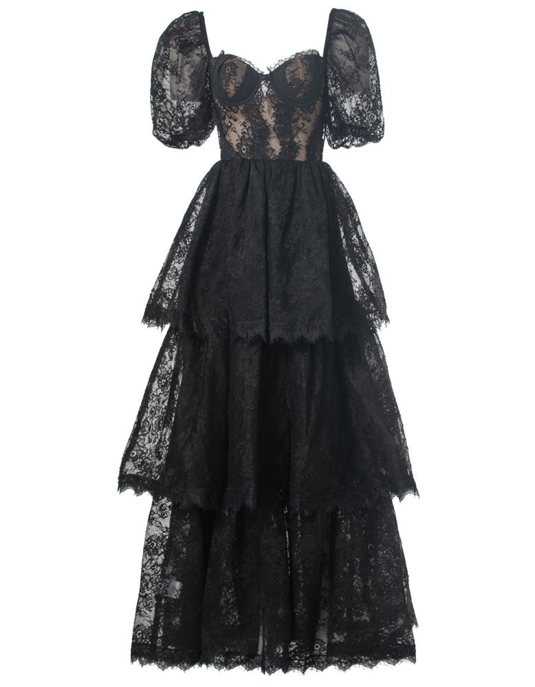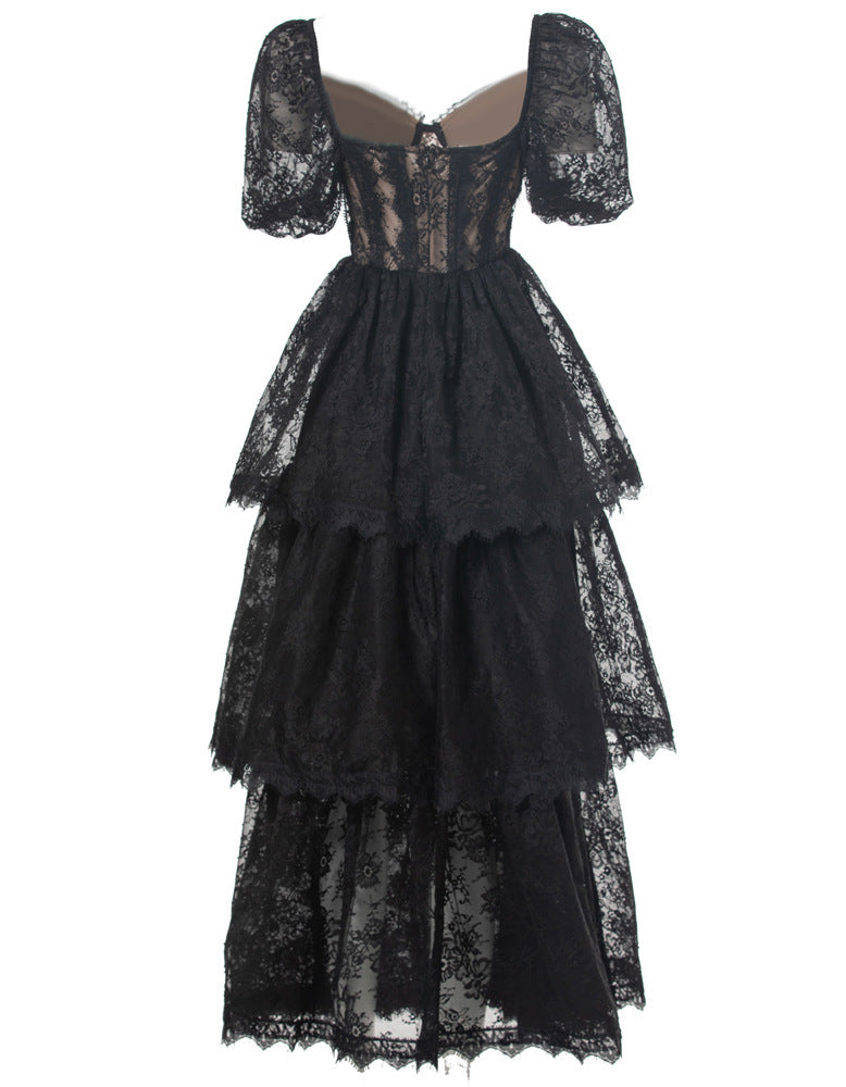 A romantic, layered lace dress with a semi-sheer corset bodice, puff sleeves, and a layered A-line. It features subtle detailing for graceful movement and timeless elegance. Available in black and white.
