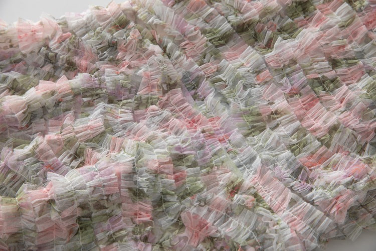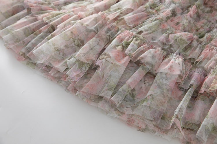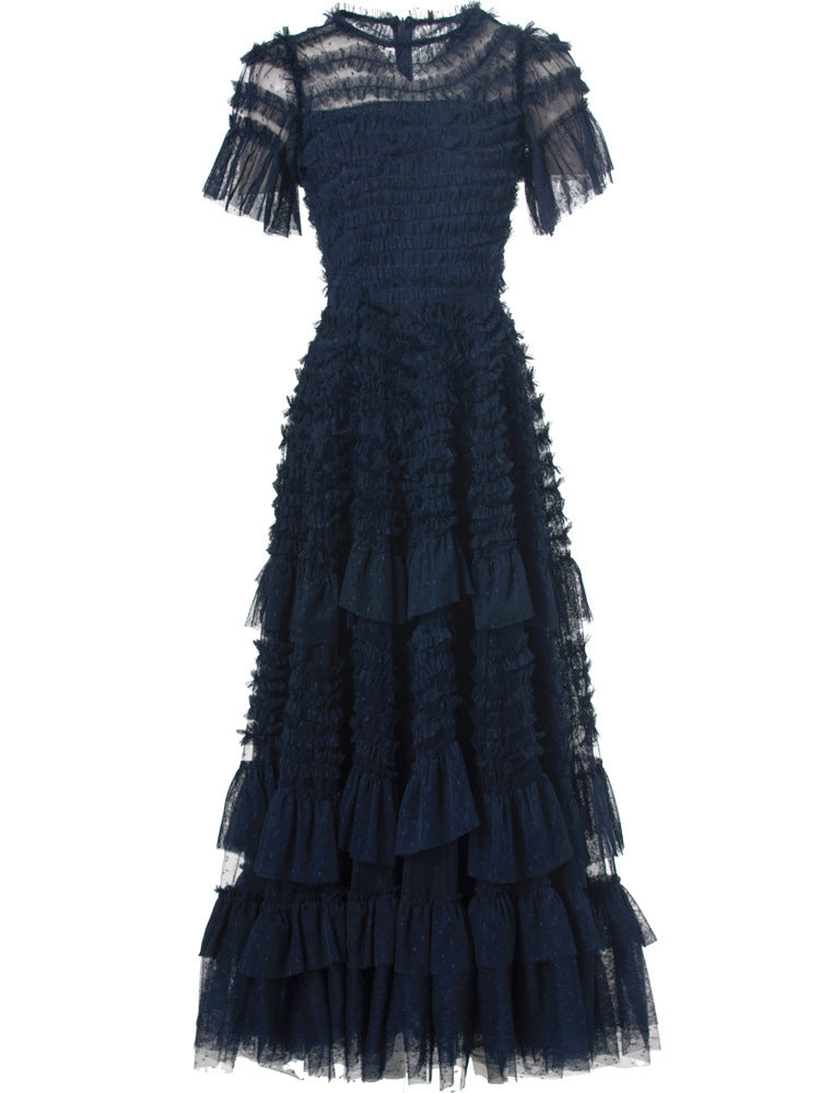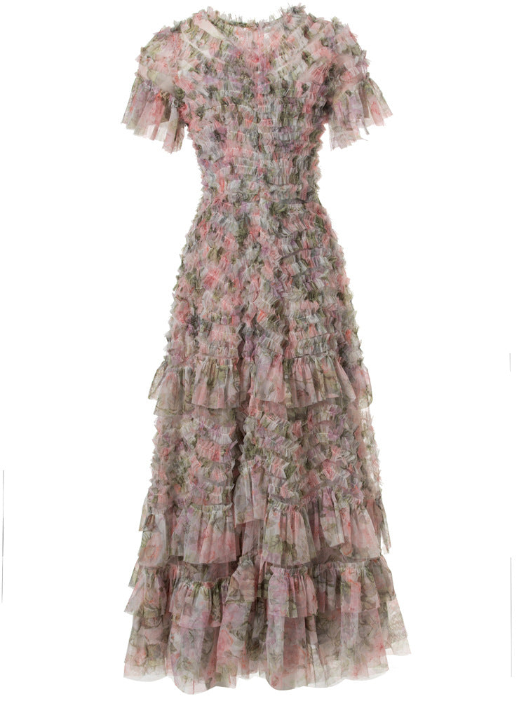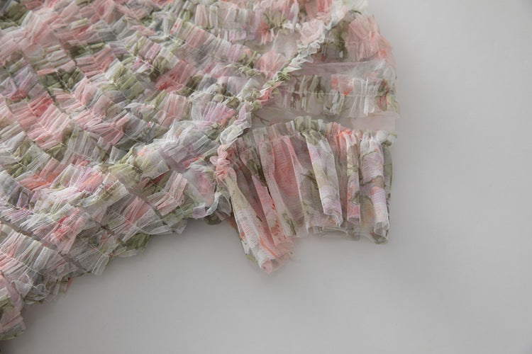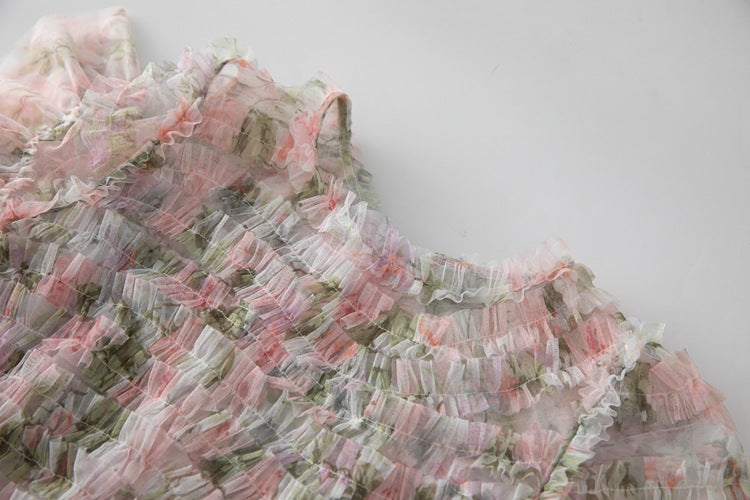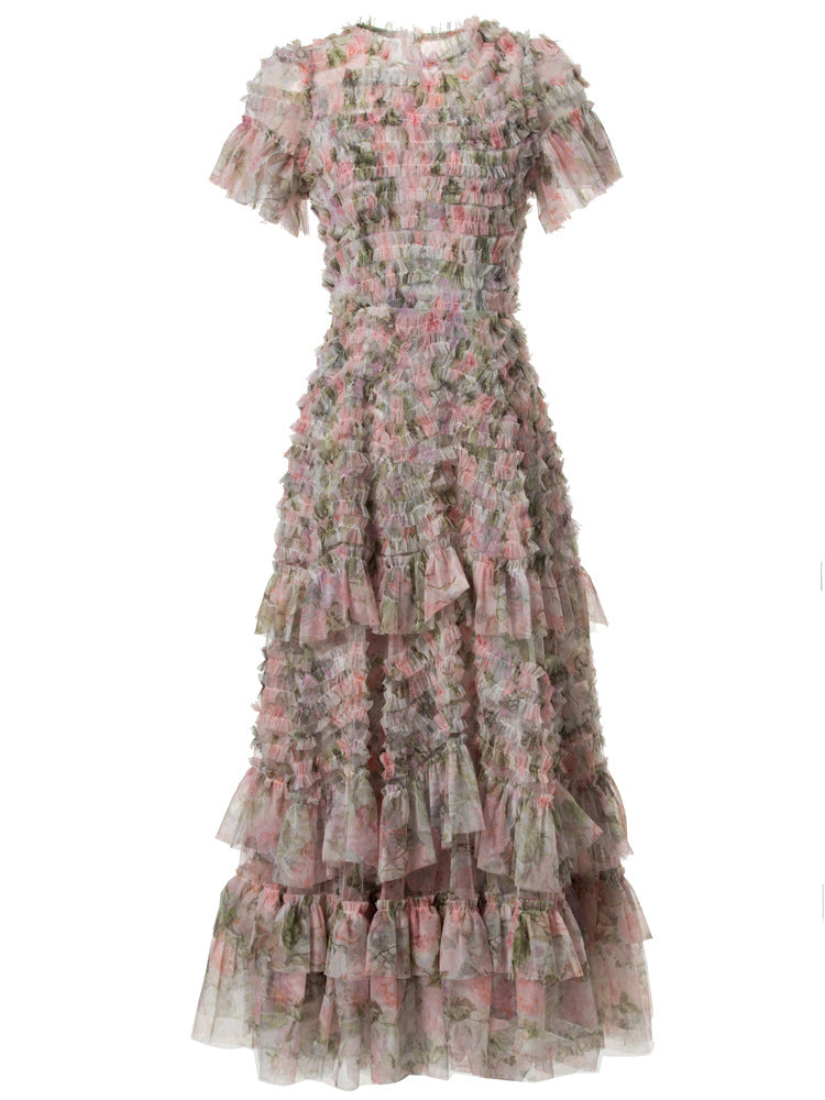 This romantic midi dress with short sleeves features tiered sheer tulle ruffles, adorned with delicate floral patterns. Designed with a feminine silhouette and elegant movement, it's available in soft pastel and navy colors for a variety of combinations.
