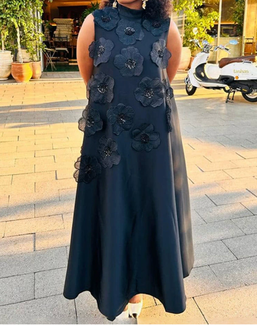 sleeveless A-line maxi dress with 3D floral appliqués – BLOSSOM