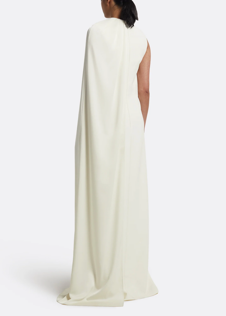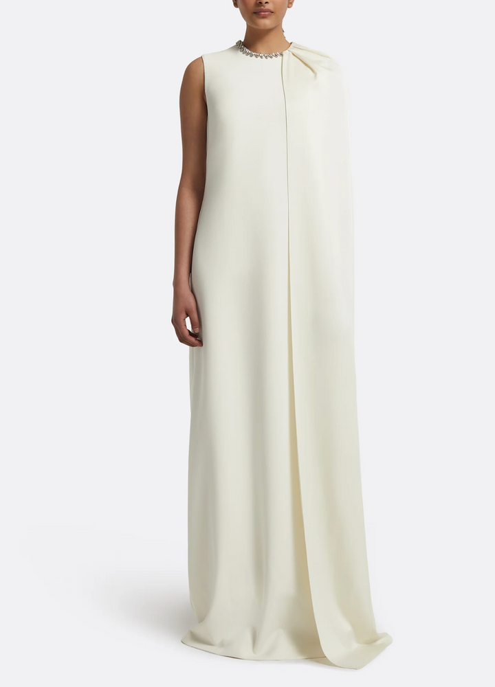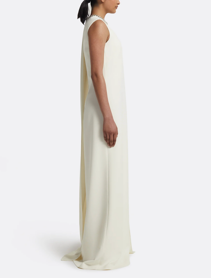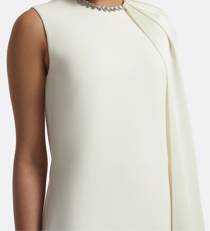 Graceful ivory gown featuring a flowing cape overlay and sleeveless silhouette, finished with a softly gathered shoulder and sparkling crystal-embellished neckline. A refined choice for modern elegance.