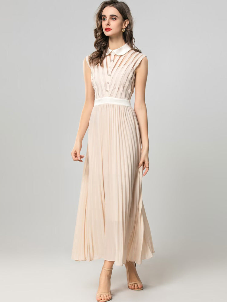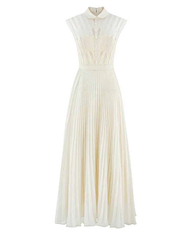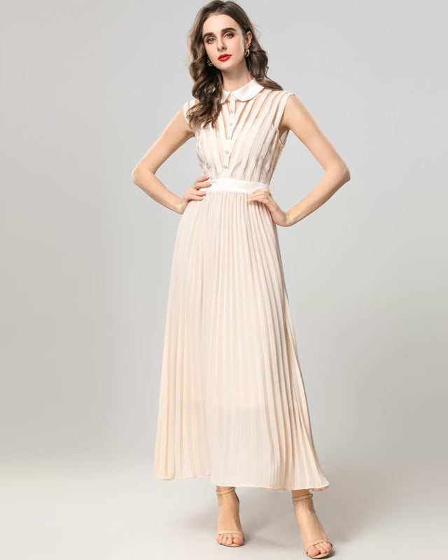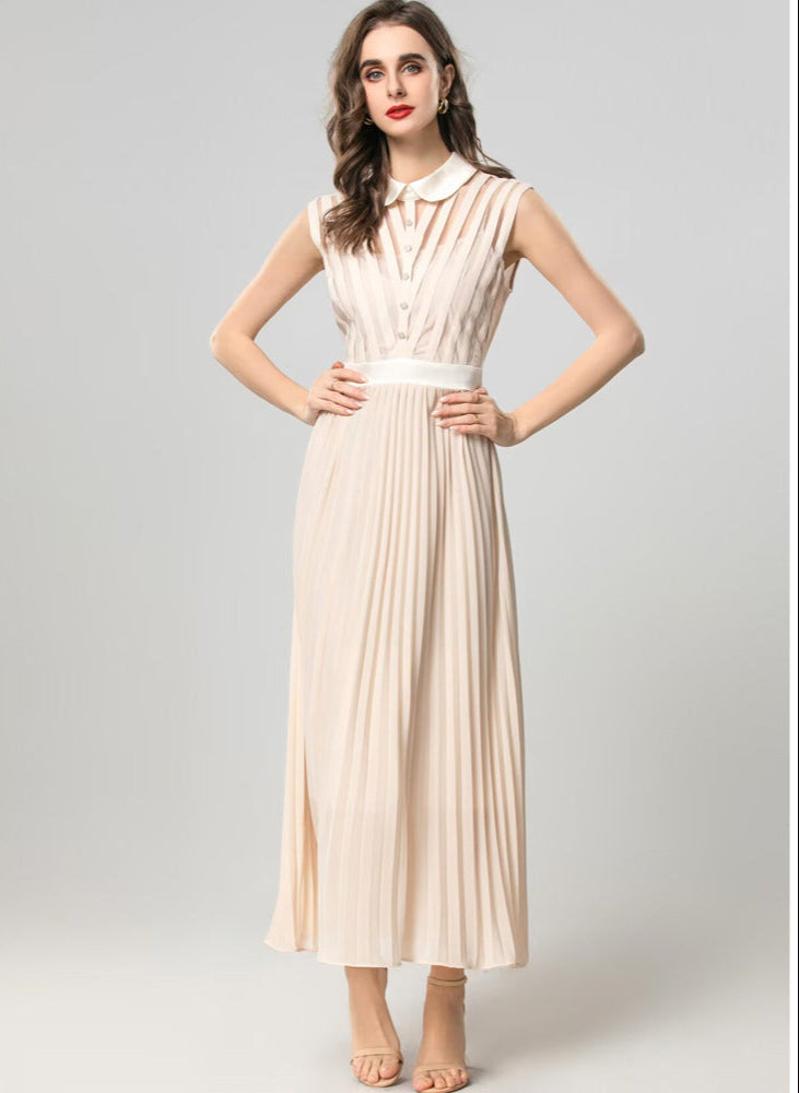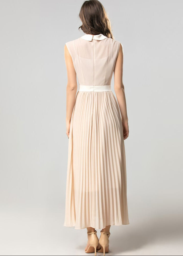 This elegant sleeveless dress features a chic white collar, a button-up bodice, and flowing pleats. Its soft neutral color and flattering design make it perfect.