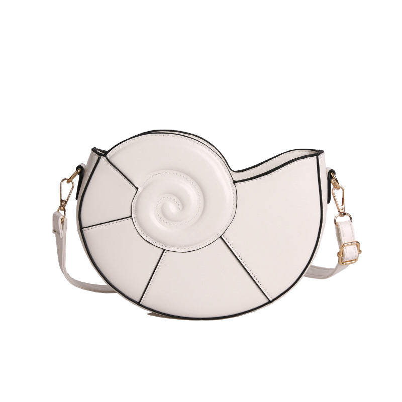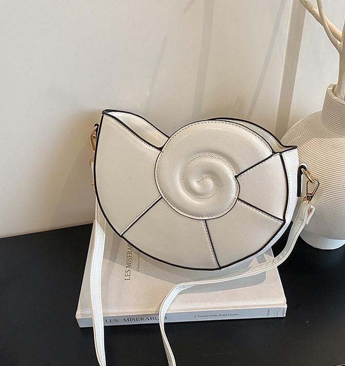 A stylish and modern crossbody bag inspired by the spiral shape of a seashell. Crafted from soft faux leather with gold accents, it adds a charming artistic touch to your contemporary look.