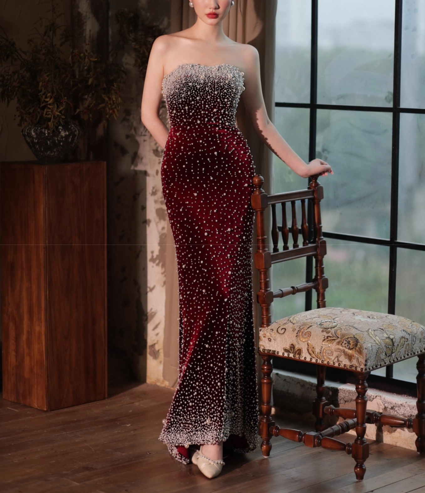A luxurious burgundy velvet gown designed with a strapless silhouette, richly adorned with cascading pearl embellishments that create a sparkling ombré effect. Elegant and sculpted for a refined evening presence. Fabric name: VELVET Size Shoulder (cm) Bust (cm) Waist (cm) Hips (cm) Length (cm) 2XS - 80 62 88 145 XS - 84 66 90 145 S - 88 70 94 145 M - 92 74 98 145