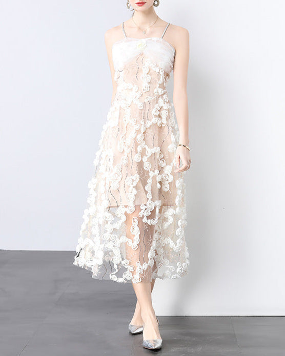 A romantic midi dress adorned with flowing 3D white floral embroidery and delicate feather detailing at the bodice. It features delicate spaghetti straps and a flowing A-line silhouette.