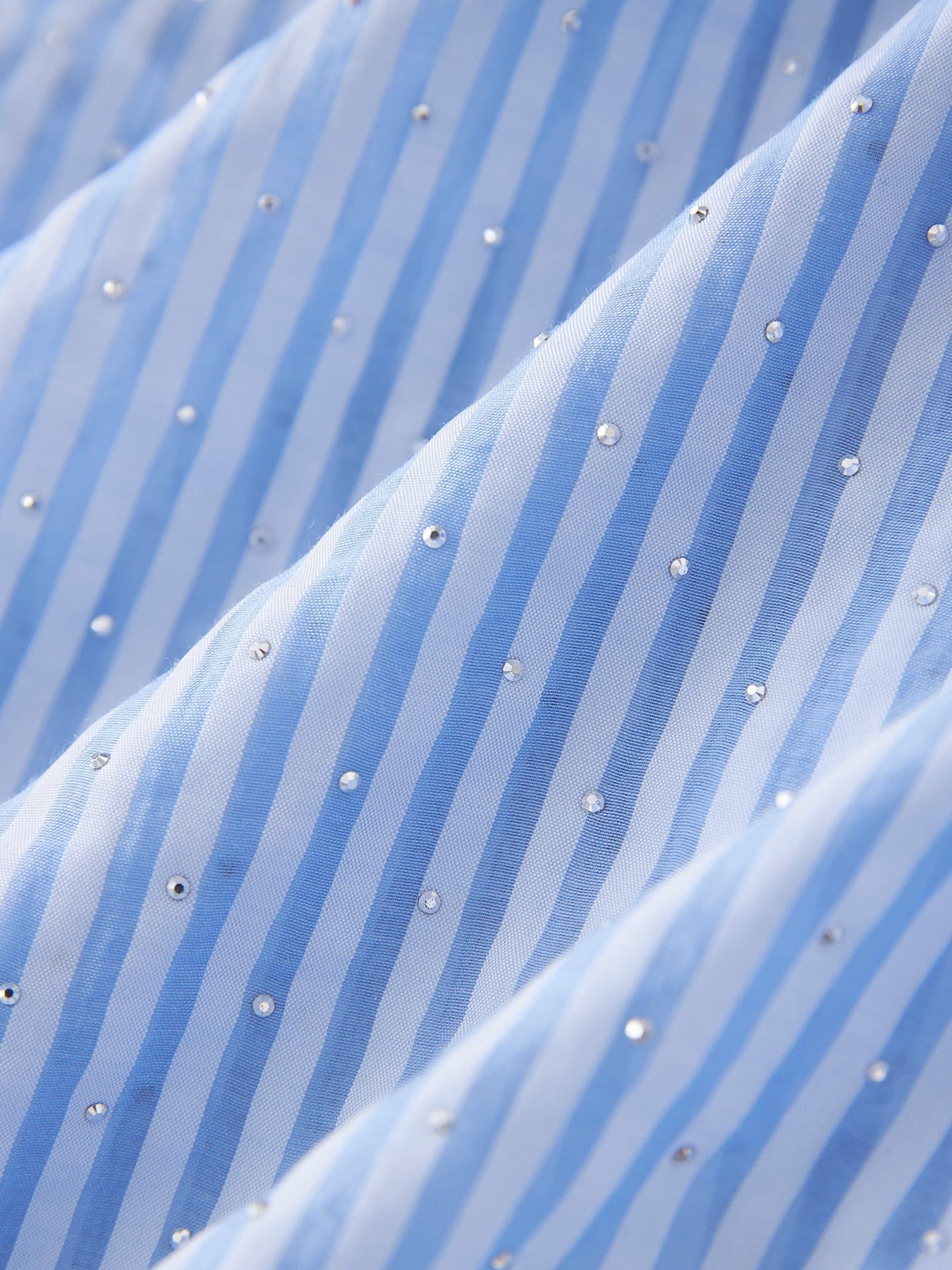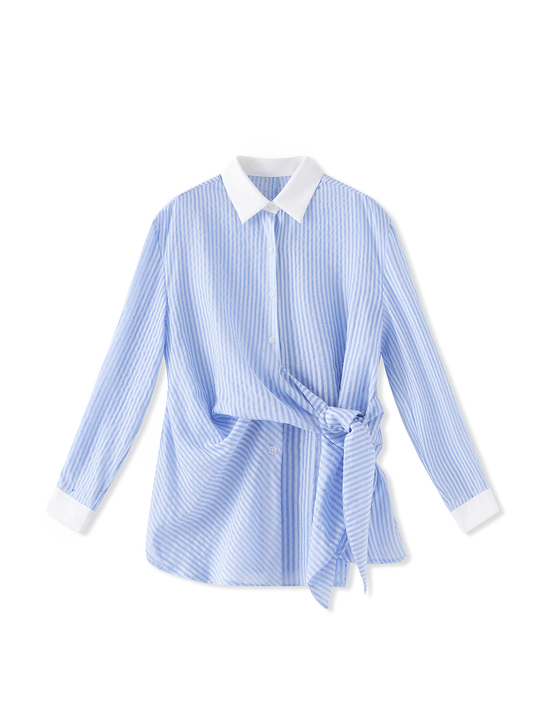 Stylish and modern, this striped shirt features a wrap design with a stylish contrast collar and a unique drawstring waist design. It adds a stylish touch.