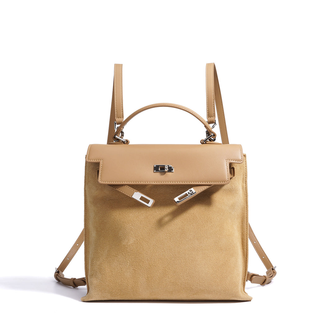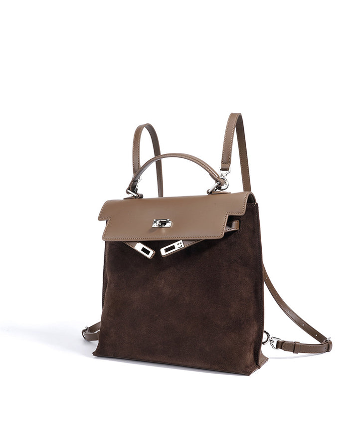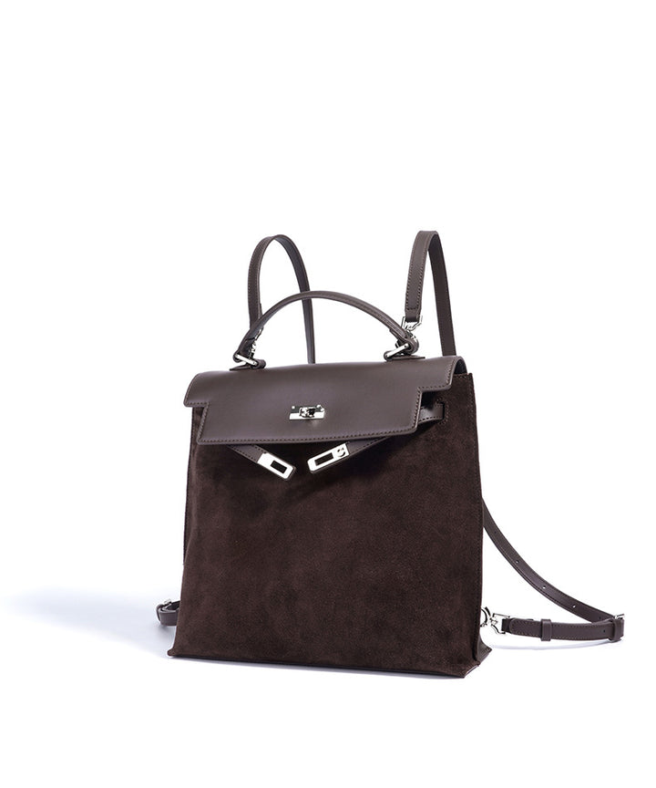 Sophisticated and versatile, this deep chocolate suede backpack features a sharp leather flap and polished silver-tone hardware. Perfectly blends luxury design with everyday practicality.
