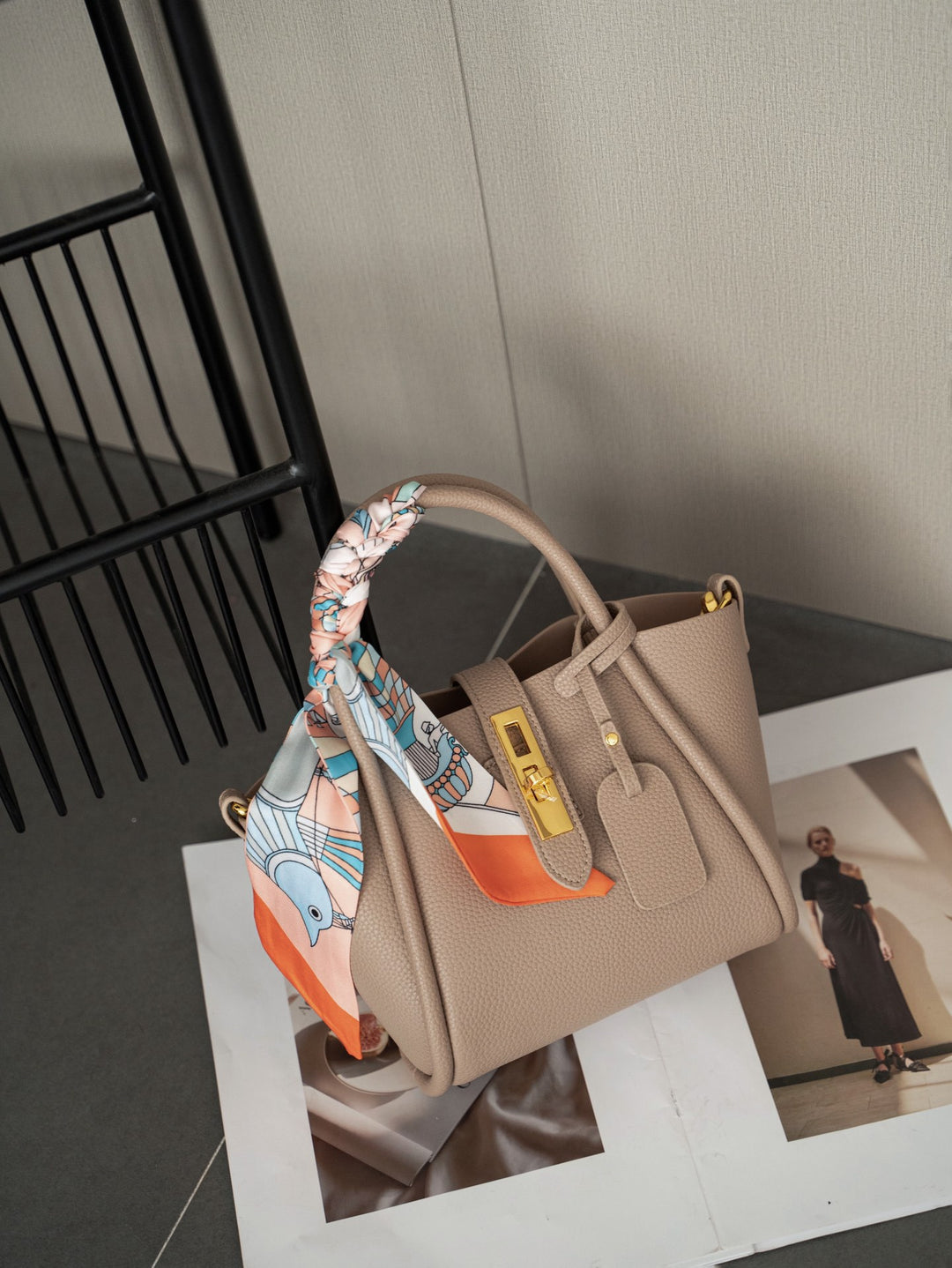 This elegant leather handbag features a chic design, accented with a gold-tone lock and a playful printed silk scarf. Its refined design and double handles make it a perfect addition to your wardrobe. It comes with a detachable shoulder strap for versatile carrying.