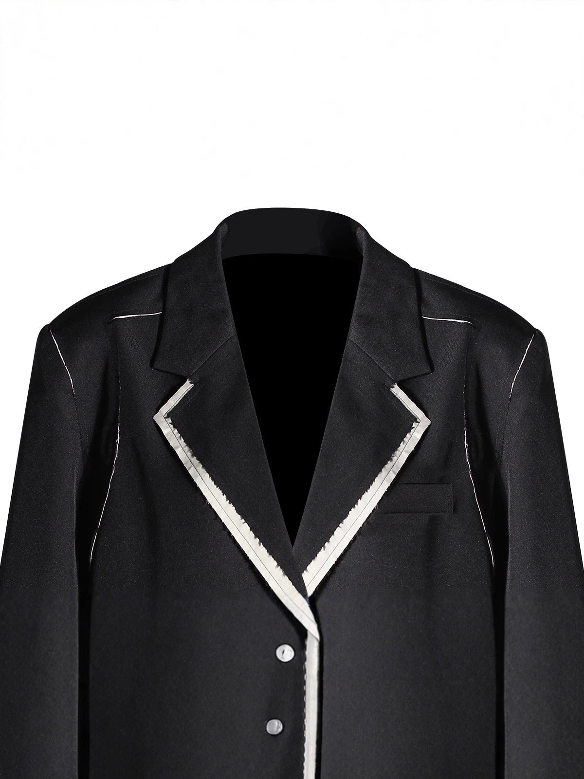 Sophisticated black blazer designed with clean tailored lines and sharp white contrast trim along the lapels for a modern twist. Features structured shoulders, dual front pockets, and a classic two-button closure—perfect for refined day-to-night looks.