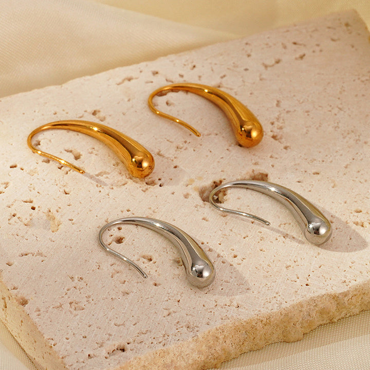Contemporary teardrop-shaped earrings, available in polished gold and silver finishes, feature a sleek, flexible design inspired by molten metal, creating a simple yet appealing look. Lightweight and effortlessly elegant, they're perfect for everyday wear and special occasions. Style them with a sleek updo or loose waves to showcase their sculptural design.