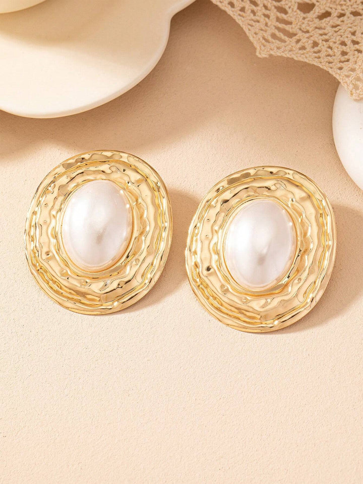 These elegant earrings feature a bold oval silhouette framed by a textured gold-tone setting, perfectly encasing a luminous faux pearl center. The combination of vintage charm and modern craftsmanship makes them a timeless statement piece—ideal for elevating both casual and formal looks.