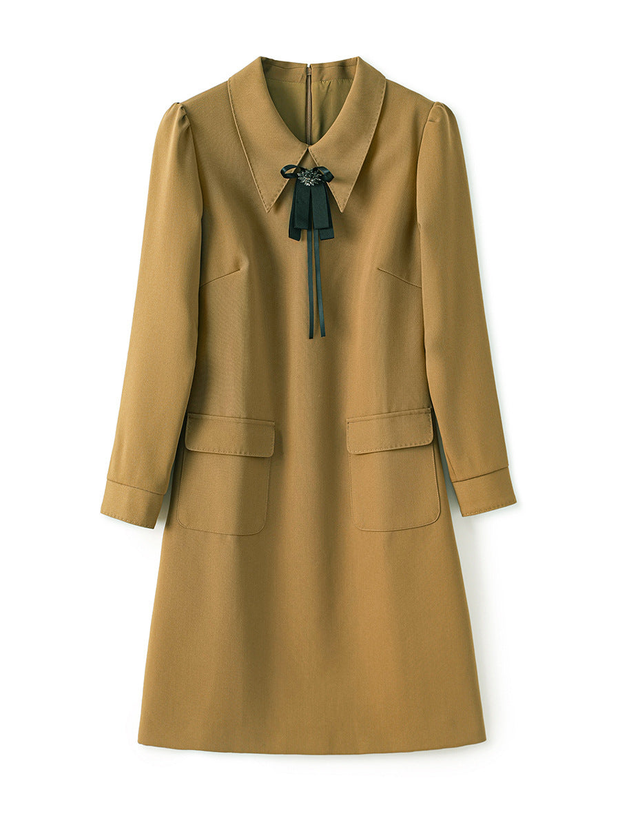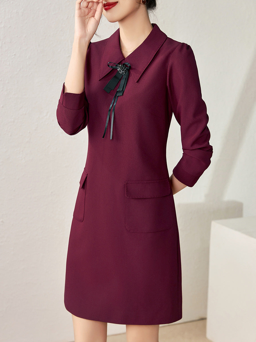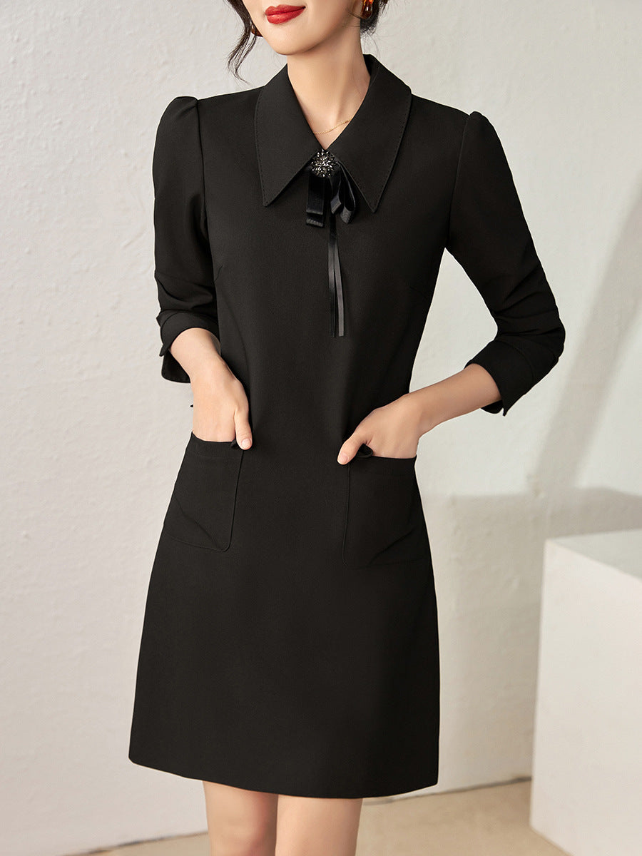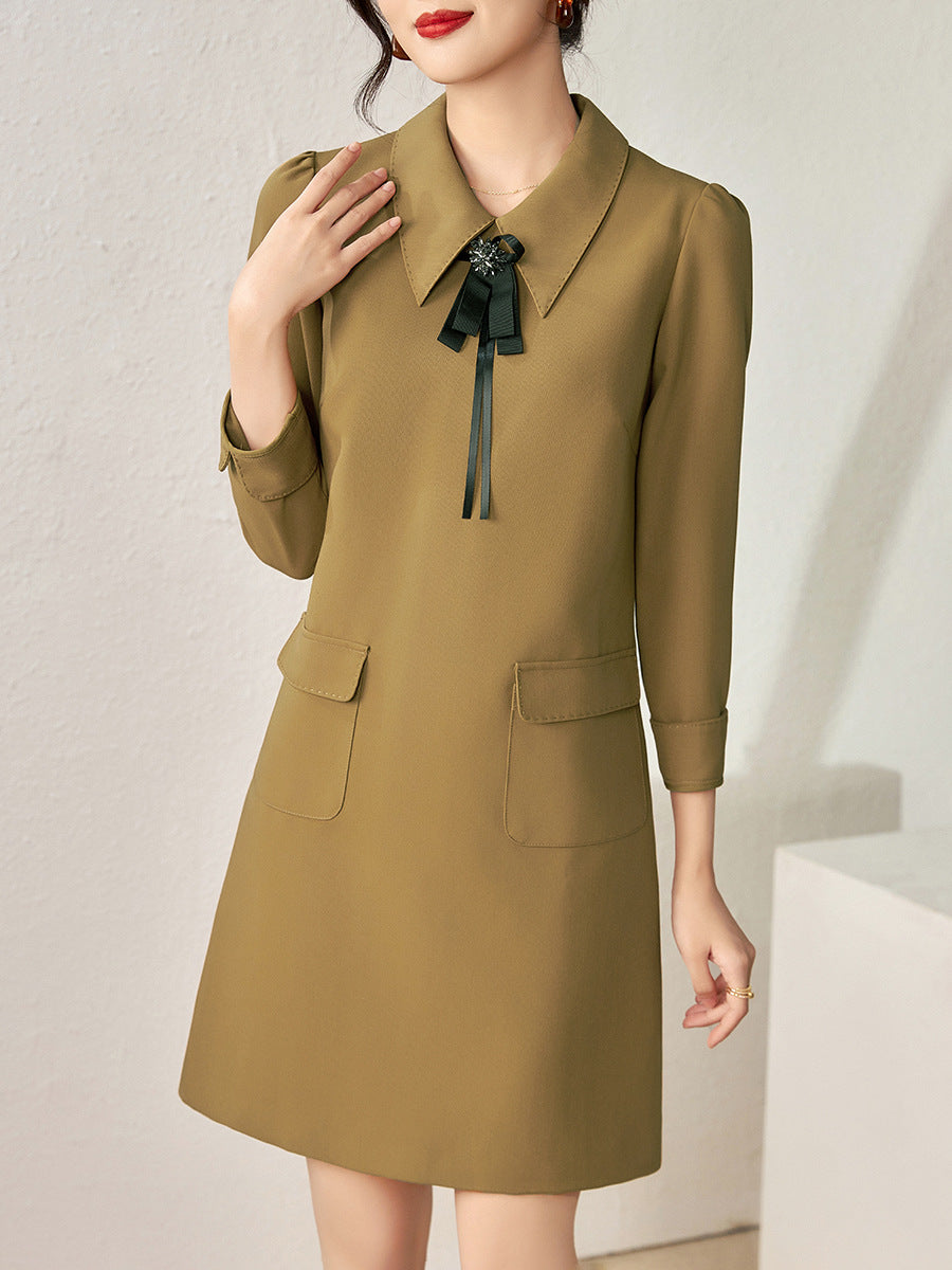 Classic A-line dress with elegant three-quarter sleeves, a pointed collar with decorative ribbon pin detailing, and side flap pockets for a chic look.
