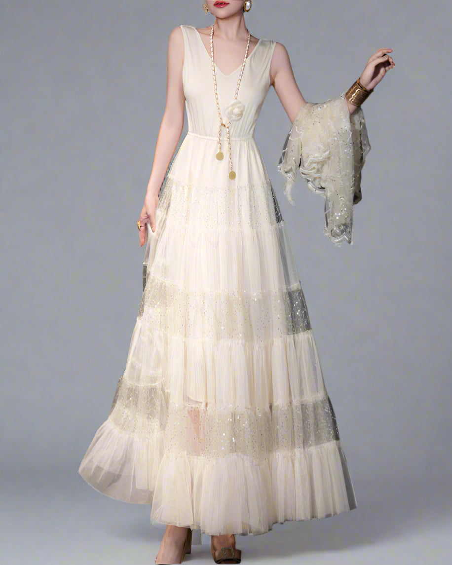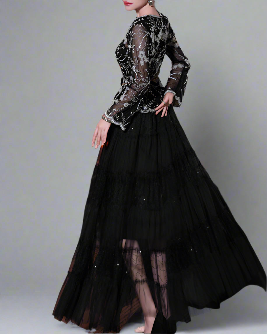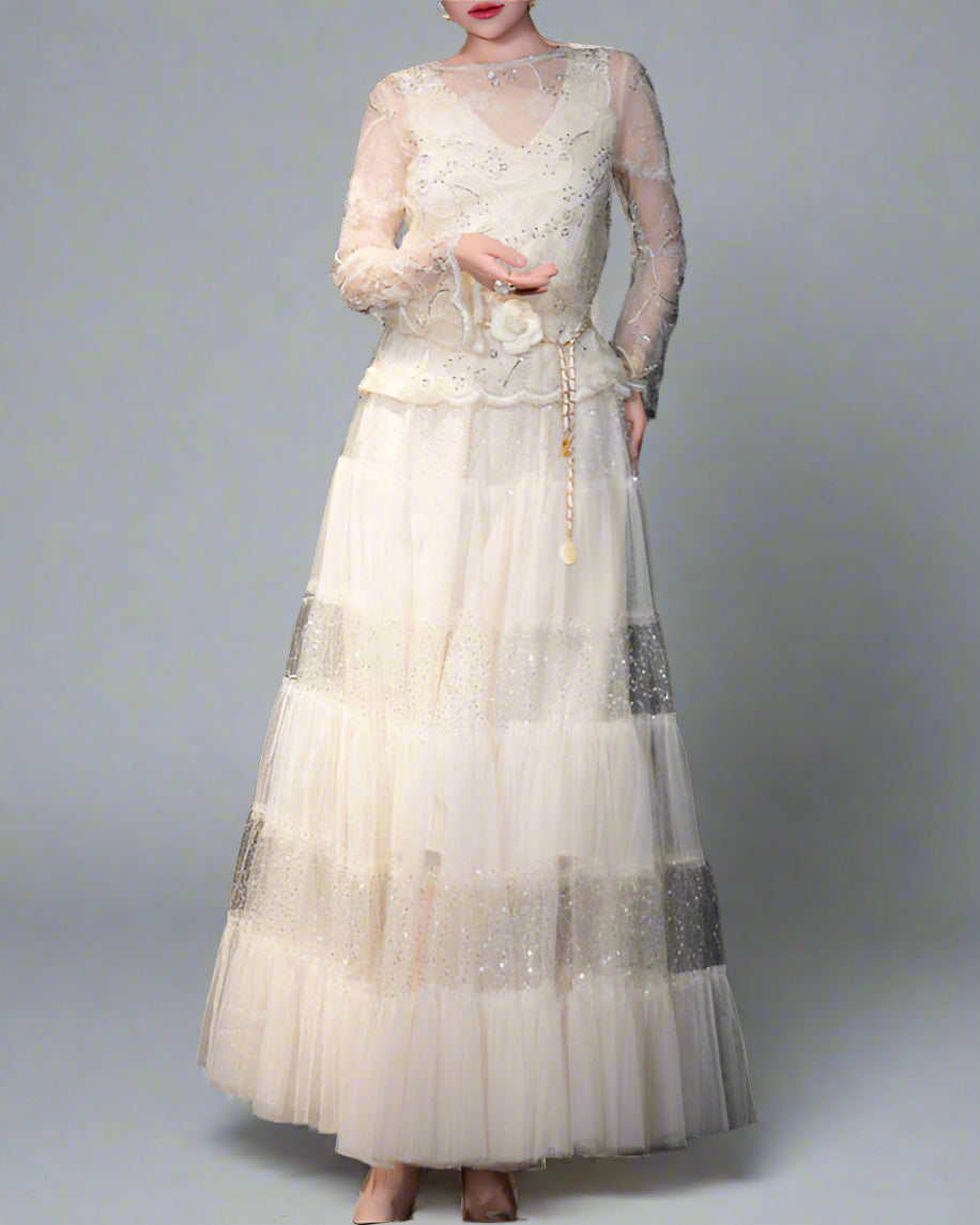 这款优雅的长袖中长连衣裙采用柔软、轻便的面料制成,具有流畅的宽松版型。它的柔软下垂腰线增添了成熟感,圆领设计和时尚的中长裙摆。