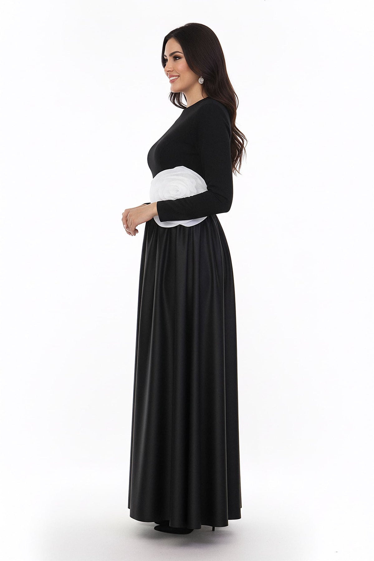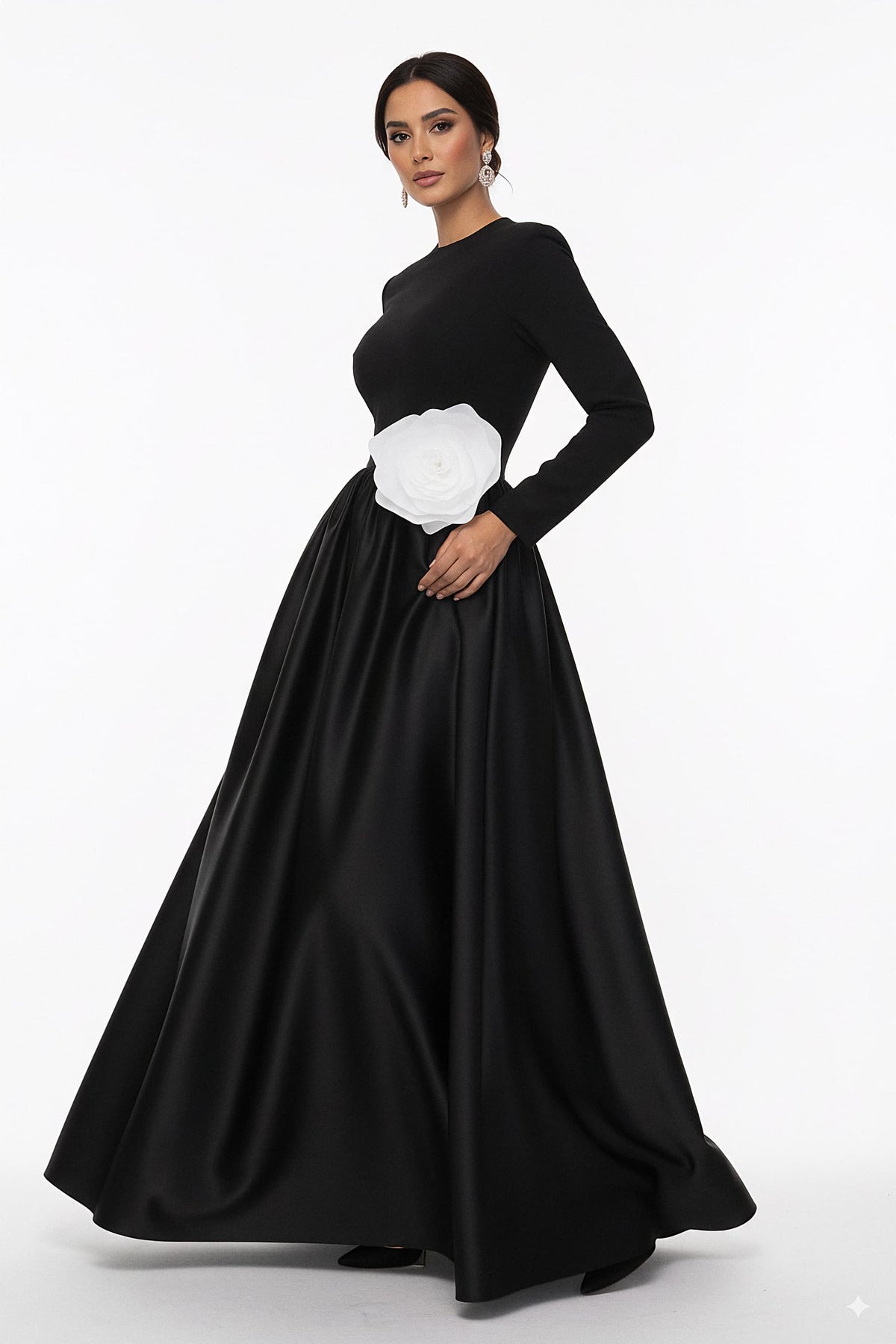 Dramatic black gown crafted in sleek satin, featuring a fitted long-sleeve bodice and a voluminous skirt. A bold oversized white flower embellishment at the waist adds modern elegance and contrast—ideal for striking evening entrances.